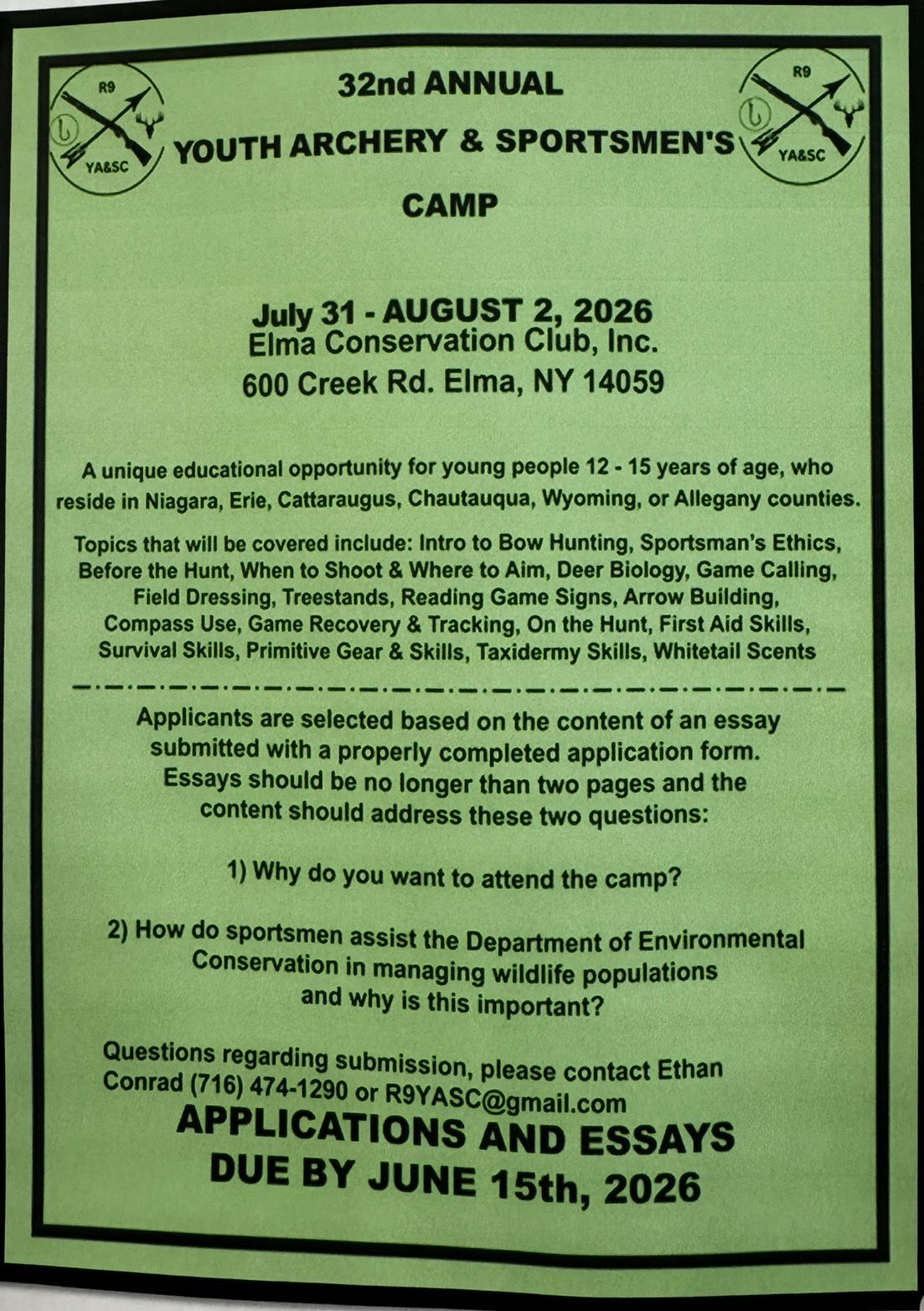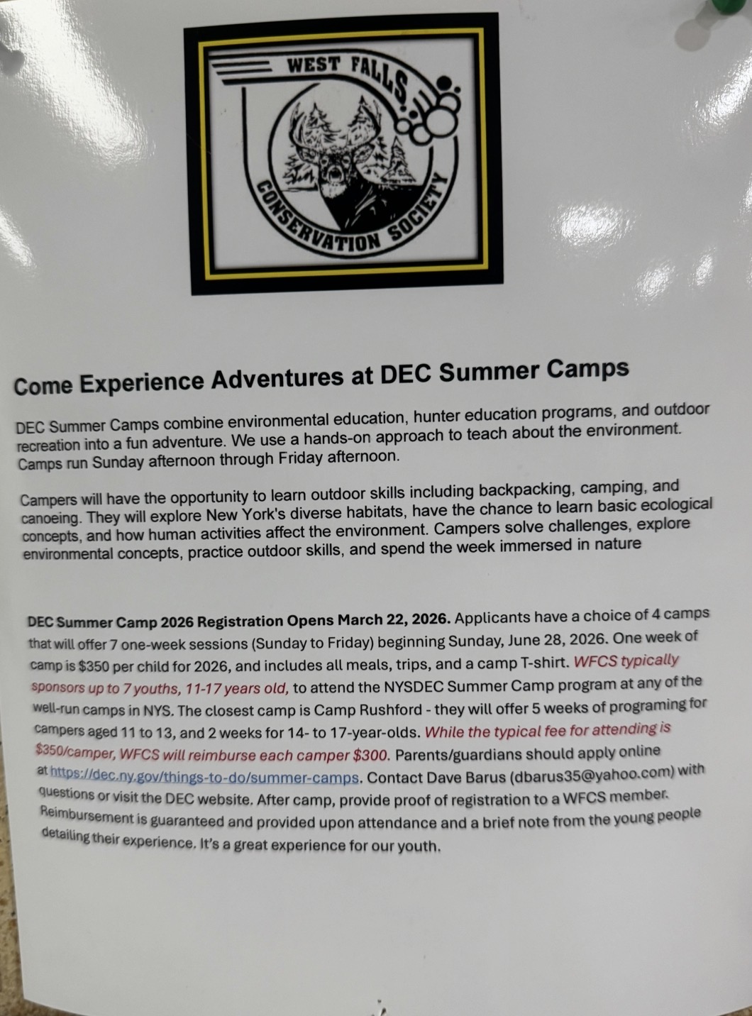 Bulletin Board [caption id="attachment_5269" align="alignleft" width="193"] Hawkeye Shoot[/caption] West Falls Conservation Member 3 D Archery Course 15 Stations with 21 targets located on the hill to the left of the Gun Rang [caption id="attachment_5265" align="alignleft" width="212"] 2026 Youth Camp Elma[/caption] [caption id="attachment_5268" align="alignleft" width="222"] DEC Rushford Camp[/caption]